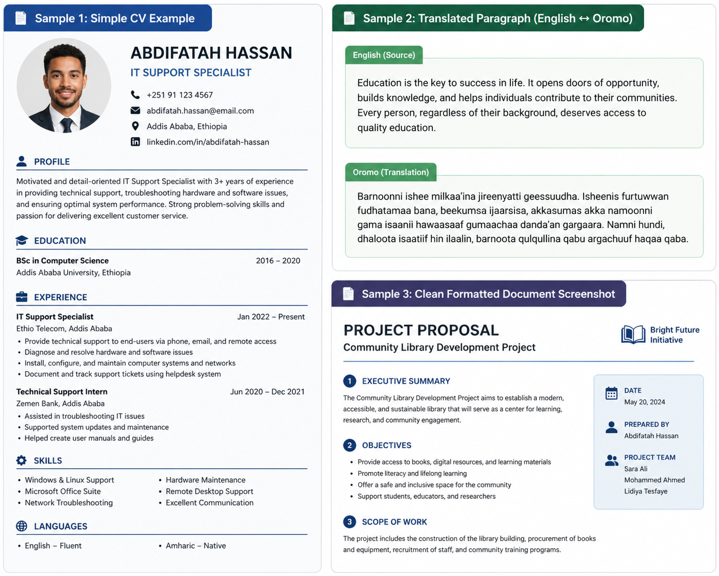 English ↔ Arabic ↔ Oromo translation